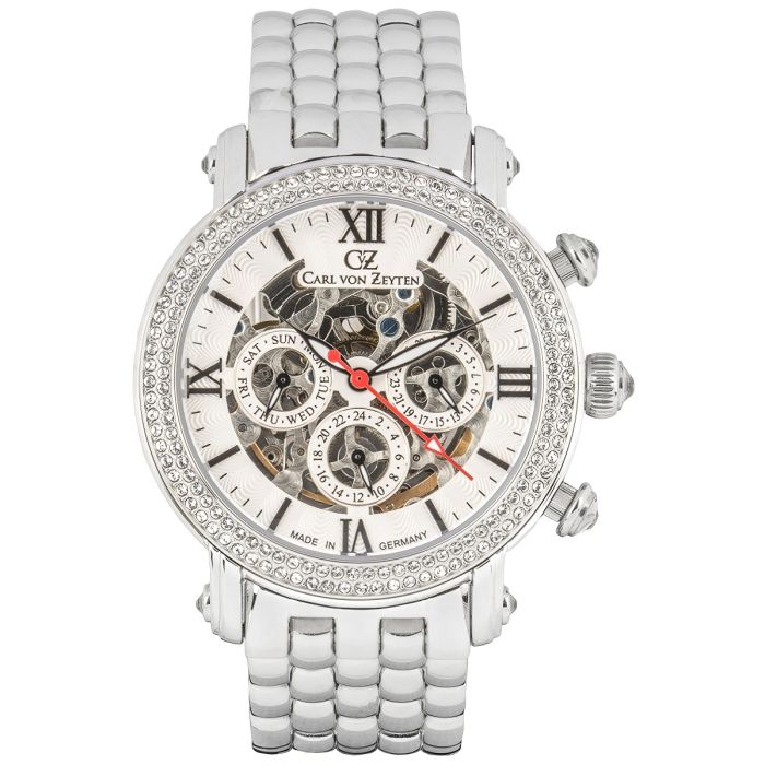 The Carl von Zeyten Kniebis Skeleton Automatic CVZ0062WHMS is a ladies’ watch that impresses with both style and functionality. Its white skeleton dial, protected by sapphire glass, showcases a 420 caliber automatic movement with 20 jewels. Additional features of the watch include a day-of-the-month, day-of-the-week and daily time indicator. The envelope made of 316L stainless steel in silver color harmonizes with the bracelet made of brass and metal in the same shade. With a water resistance of 50 meters, the model is splash-proof, making it suitable for wearing while bathing or showering.