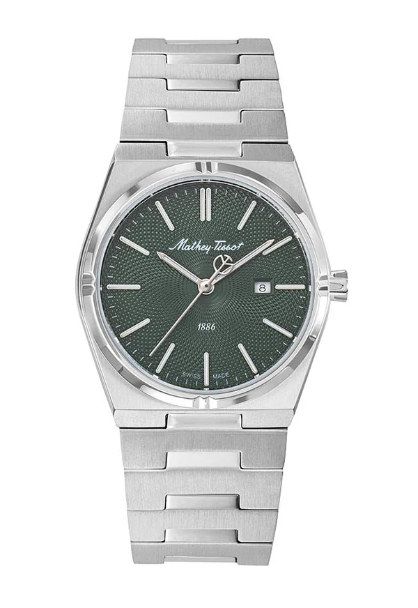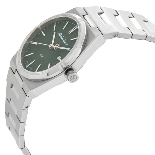 & Free ShippingSilver-tone stainless steel case and bracelet. Fixed silver-tone stainless steel bezel. Green dial with silver-tone hands and index hour markers. Minute markers around the outer rim. Dial Type: Analog. Luminescent hands and markers. Date display at the 3 o’clock position. Ronda Caliber 585 quartz movement. Scratch resistant sapphire crystal. Pull / push crown. Solid case back. Round case shape, case size: 34 mm. Fold over clasp with a safety release. Functions: date, hour, minute, second. Zeus Series. Casual watch style. Watch label: Swiss Made. Mathey-Tissot Zeus Quartz Green Dial Ladies Watch D118AV.