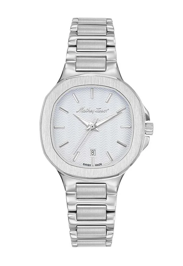 & Free ShippingStainless steel case with a stainless steel bracelet. Fixed stainless steel bezel. Silver dial with luminous silver-tone hands and index hour markers. Dial Type: Analog. Luminescent hands. Date display above the 6 o’clock position. Quartz movement. Scratch resistant sapphire coated crystal. Pull / push crown. Solid case back. Pillow case shape. Case size: 32 mm. Case thickness: 8 mm. Band width: 16 mm. Butterfly clasp. Water resistant at 50 meters / 165 feet. Functions: date, hour, minute, second. Evasion Series. Casual watch style. Watch label: Swiss Made. Mathey-Tissot Evasion Silver Dial Ladies Watch D152AI
