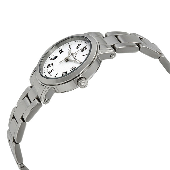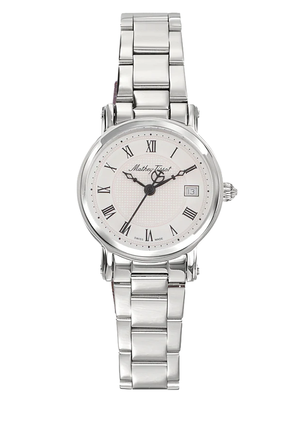 & Free ShippingStainless steel case with a stainless steel bracelet. Fixed stainless steel bezel. White dial with silver-tone hands and Roman numeral hour markers. Minute markers around the outer rim. Dial Type: Analog. Date display at the 3 o’clock position. Ronda caliber 775 quartz movement. Scratch resistant mineral crystal. Pull / push crown. Solid case back. Round case shape. Case size: 28 mm. Case thickness: 3 mm. Bracelet width: 14 mm. Deployment clasp. Water resistant at 30 meters / 100 feet. Functions: date, hour, minute, second. Casual watch style. Watch label: Swiss Made. Mathey-Tissot City White Dial Ladies Watch D31186MABR.