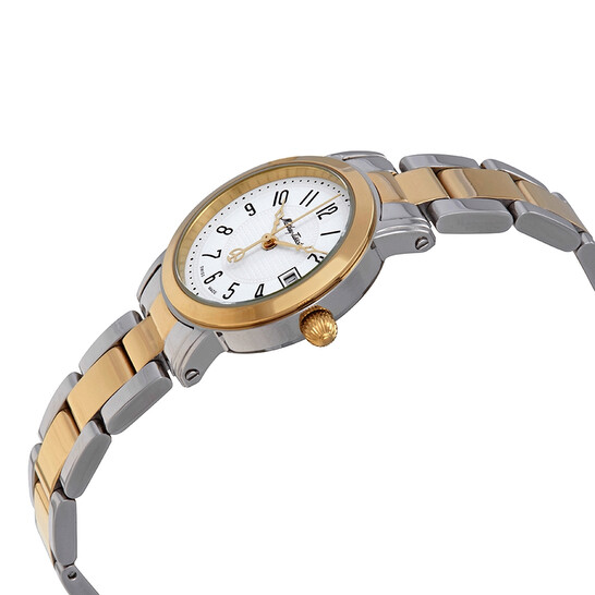 & Free ShippingStainless steel case with a two-tone (silver-tone and yellow gold PVD) stainless steel bracelet. Fixed yellow gold PVD bezel. Silver-tone dial with yellow gold-tone hands and Arabic numeral hour markers. Minute markers around the outer rim. Dial Type: Analog. Date display at the 3 o’clock position. Ronda caliber 775 quartz movement. Scratch resistant sapphire crystal. Pull / push crown. Solid case back. Round case shape. Case size: 28 mm. Case thickness: 3 mm. Band width: 14 mm. Deployment clasp. Water resistant at 30 meters / 100 feet. Functions: date, hour, minute, second. Casual watch style. Watch label: Swiss Made. Mathey-Tissot City Silver Dial Two-tone Ladies Watch D31186MBG.