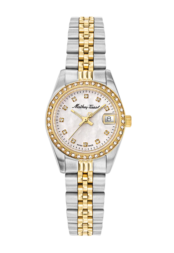 & Free ShippingThis watch comes in two-tones i.e. silver-tone and gold-tone stainless steel 316L case with a two-tone stainless steel 316L bracelet. Fixed yellow gold-tone stainless steel bezel. White dial with yellow gold-tone hands and index hour markers. Minute markers around the outer rim. Luminescent hands and markers. Date display at the 3 o’clock position. Ronda Caliber 585 h3 quartz movement. Scratch resistant mineral crystal. Pull and push crown. Stainless steel 316L case back.