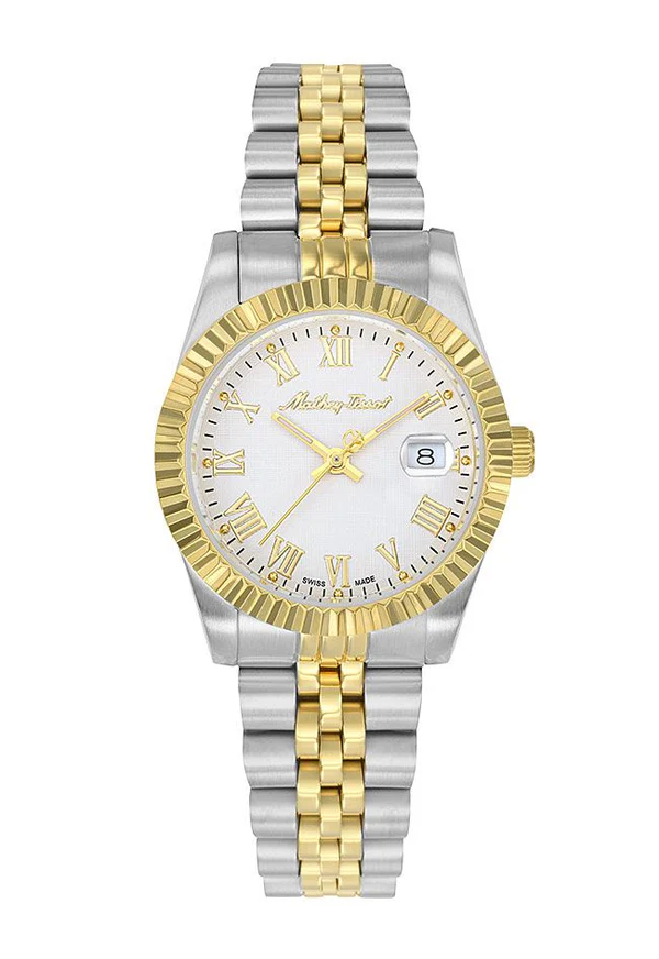 & Free ShippingThe Mathey-Tissot Mathy III watch is truly a contemporary masterpiece. The stylish stainless steel case and bracelet, paired with the fixed stainless steel bezel, deliver an undeniable charm and allure, perfect for any modern individual. The 32 mm dial glows brilliantly with gold-tone hands and Roman numeral hour markers, flanked by minute markers and an outer rim. An easy-to-read date display rests unobtrusively at the 3 o’clock position. Its 50 m water resistance allows worry-free wear. The Swiss-operated Ronda Caliber 585 quartz movement powers this elegant timepiece.