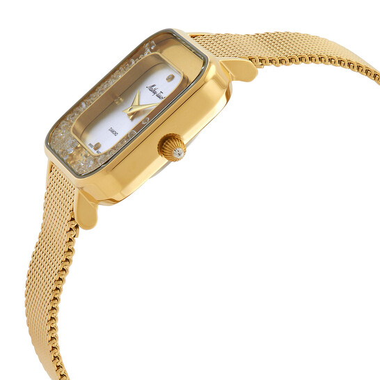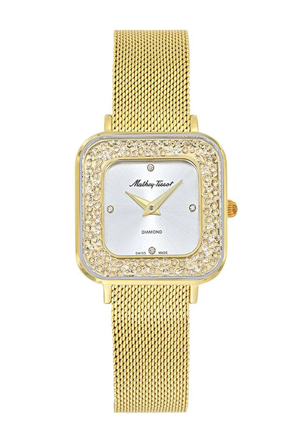 & Free ShippingGold-tone stainless steel case with a gold-tone stainless steel mesh bracelet. Fixed gold-tone stainless steel bezel. Silver dial with gold-tone hands and diamond hour markers. Dial Type: Analog. Ronda Caliber 762 quartz movement. Scratch resistant sapphire crystal. Pull / push crown. Solid case back. Square case shape, case size: 28 mm, case thickness: 6 mm. Water resistant at 50 meters / 165 feet. Functions: hour, minute. Gemina Series. Dress watch style. Watch label: Swiss Movt. Mathey-Tissot Gemina Quartz Diamond Silver Dial Ladies Watch D984SPYI.