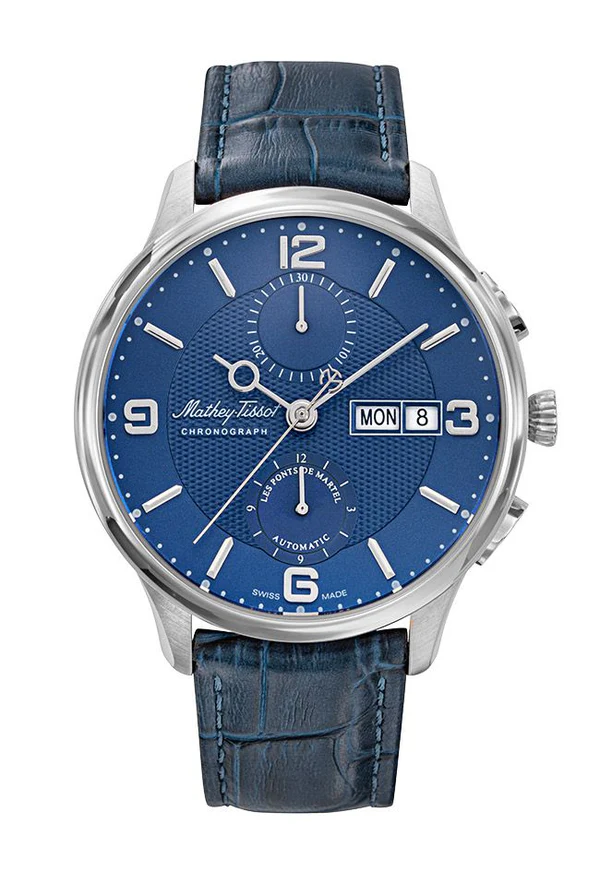 & Free ShippingStainless steel case with a blue leather strap. Fixed stainless steel bezel. Blue dial with silver-tone hands and index hour markers. Arabic numerals appear at the 3, 6, 9 and 12 o’clock positions. Minute markers around the outer rim. Dial Type: Analog. Day of the week and date display at the 3 o’clock position. Chronograph – two sub-dials displaying: 30 minutes and 12 hours. Landeron 77 automatic movement. Scratch resistant mineral crystal. Pull push crown. Transparent case back. Round case shape. Case size: 42 mm.