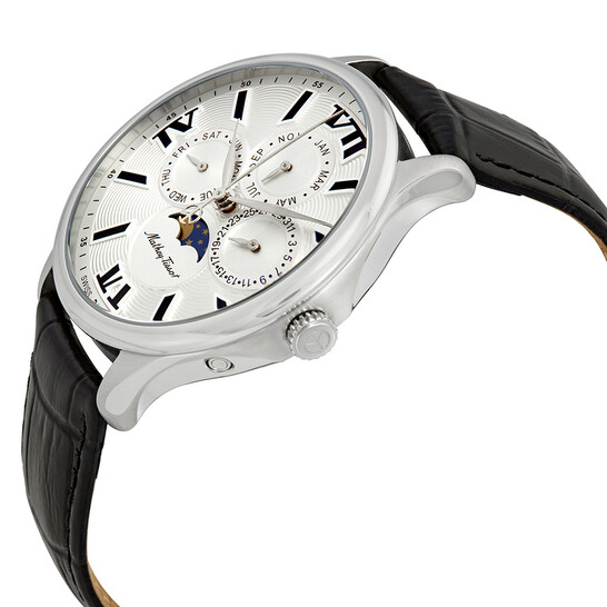 & Free ShippingStainless steel case with a black leather strap. Fixed stainless steel bezel. Silver dial with silver-tone hands and index hour markers. Roman numerals mark the 3, 6, 9 and 12 o’clock positions. Minute markers around the outer rim. Dial Type: Analog. Date display at the 3 o’clock position. Four sub-dials displaying: date, day of the week, month, and moonphase. Ronda caliber 706.3 quartz movement. Scratch resistant sapphire crystal. Pull / push crown. Solid case back. Round case shape. Case size: 42 mm. Case thickness: 11 mm. Band width: 20 mm. Fold over clasp with a push button release. Water resistant at 50 meters / 165 feet. Functions: moon phase, month, date, day, hour, minute, second. Edmond Moon Series. Dress watch style. Watch label: Swiss Made. Mathey-Tissot Edmond Moon Phase Silver Dial Men’s Watch H1886RAI.