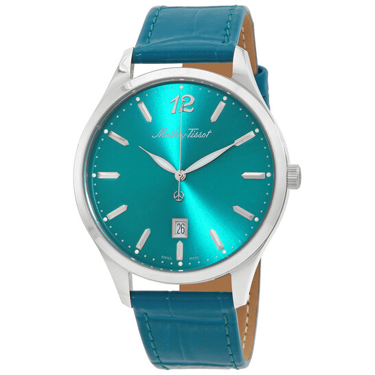& Free ShippingSilver-tone stainless steel case with a green leather strap. Fixed silver-tone stainless steel bezel. Green dial with silver-tone hands and index hour markers. Arabic numeral appears at the 12 o’clock position. Minute markers around the outer rim. Dial Type: Analog. Luminescent hands and markers. Date display at the 6 o’clock position. Ronda Caliber 515 quartz movement. Scratch resistant sapphire glass crystal. Pull / push crown. Solid case back. Round case shape, case size: 42 mm, case thickness: 8 mm. Band width: 20 mm. Tang clasp. Water resistant at 50 meters / 165 feet. Functions: date, hour, minute, second. Urban Series. Casual watch style. Watch label: Swiss Made. Mathey-Tissot Urban Quartz Green Dial Men’s Watch H411PET.
