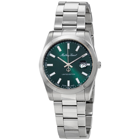 & Free ShippingStainless steel case with a stainless steel bracelet. Fixed stainless steel bezel. Green dial with luminous silver-tone hands and index hour markers. Arabic numeral minute markers (at 5 minute intervals). Minute markers around the outer rim. Dial Type: Analog. Luminescent hands and markers. Date display at the 3 o’clock position. Ronda caliber 505 quartz movement. Scratch resistant mineral crystal. Pull / push crown. Solid case back. Round case shape. Case size: 42 mm. Case thickness: 11 mm. Band width: 22 mm. Fold over clasp. Water resistant at 50 meters / 165 feet. Functions: date, hour, minute, second. Mathy I Le Series. Casual watch style. Watch label: Swiss Made. Mathey-Tissot Mathy I LE Quartz Green Dial Men’s Watch H451VE.