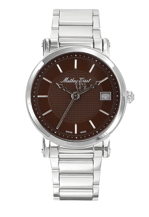 & Free ShippingStainless steel case with a stainless steel bracelet. Fixed stainless steel bezel. Brown dial with silver-tone hands and index hour markers. Minute markers around the outer rim. Dial Type: Analog. Date display at the 3 o’clock position. Quartz movement. Scratch resistant mineral crystal. Pull / push crown. Solid case back. Round case shape. Case size: 38 mm. Case thickness: 4 mm. Band width: 18 mm. Deployment clasp. Water resistant at 30 meters / 100 feet. Functions: date, hour, minute, second. Casual watch style. Watch label: Swiss Made. Mathey-Tissot City Metal Brown Dial Men’s Watch H611251MAM.