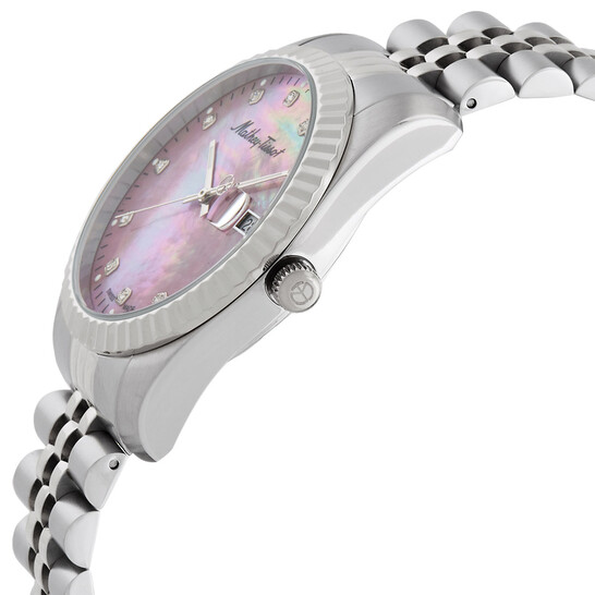 & Free ShippingSilver-tone stainless steel case and bracelet. Fixed silver-tone stainless steel bezel. Mother of pearl dial with silver-tone hands and index hour markers. Minute markers around the outer rim. Dial Type: Analog. Luminescent hands. Date display at the 3 o’clock position. Quartz movement. Scratch resistant sapphire crystal. Pull / push crown. Solid case back. Round case shape, case size: 40 mm. Fold over clasp. Water resistant at 50 meters / 165 feet. Functions: date, hour, minute, second. Mathy II Series. Casual watch style. Watch label: Swiss Made. Mathey-Tissot Mathy II Quartz Unisex Watch H710AVIO.