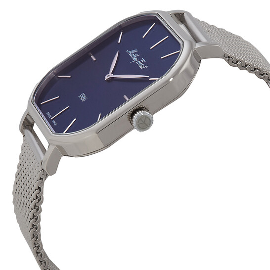 & Free ShippingSilver-tone stainless steel case and bracelet. Fixed silver-tone stainless steel bezel. Blue dial with silver-tone hands and index hour markers. Dial Type: Analog. Ronda quartz movement. Scratch resistant mineral crystal. Pull / push crown. Solid case back. Square case shape, case size: 40 mm. Fold over clasp with a safety release. Water resistant at 50 meters / 165 feet. Functions: hour, minute. Monsoon Square Series. Casual watch style. Watch label: Swiss Made. Mathey-Tissot Monsoon Square Quartz Blue Dial Men’s Watch H7917ABU.