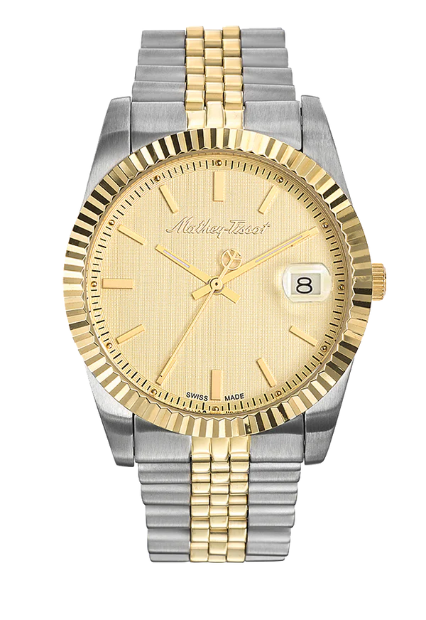 & Free ShippingStainless steel case with a two-tone (silver-tone and yellow gold-plated ) stainless steel bracelet. Fixed yellow gold-plated bezel. Gold dial with luminous yellow gold-tone hands and index hour markers. Minute markers around the outer rim. Dial Type: Analog. Luminescent hands and markers. Date display at the 3 o’clock position. Ronda caliber 515 quartz movement. Scratch resistant mineral crystal. Pull / push crown. Solid case back. Round case shape. Case size: 40 mm. Case thickness: 5 mm. Band width: 20 mm. Fold over clasp. Water resistant at 30 meters / 100 feet. Functions: date, hour, minute, second. Casual watch style. Watch label: Swiss Made. Mathey-Tissot Mathey III Quartz Gold Dial Two-tone Men’s Watch H810BDI.