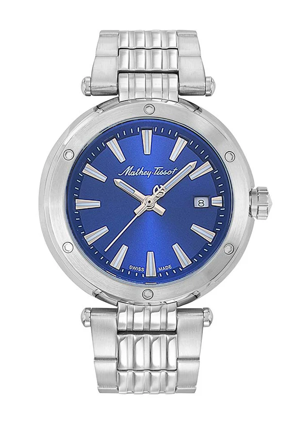 & Free ShippingMathey-Tissot Neptune Quartz Blue Dial Men’s Watch H912ABU Silver-tone stainless steel case and bracelet. Fixed silver-tone stainless steel bezel. Blue dial with silver-tone hands and index hour markers. Minute markers around the outer rim. Dial Type: Analog. Luminescent hands and markers. Date display at the 3 o’clock position. Ronda Caliber 515 quartz movement. Scratch resistant mineral crystal. Pull / push crown. Solid case back. Round case shape, case size: 42 mm. Fold over clasp with a safety release. Water resistant at 50 meters / 165 feet. Functions: date, hour, minute, second. Neptune Series. Casual watch style. Watch label: Swiss Made. Mathey-Tissot Neptune Quartz Blue Dial Men’s Watch H912ABU.