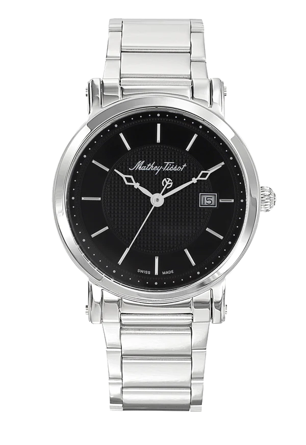 & Free ShippingStainless steel case with a stainless steel bracelet. Fixed stainless steel bezel. Black dial with silver-tone hands and index hour markers. Minute markers around the outer rim. Dial Type: Analog. Date display at the 3 o’clock position. Ronda caliber 505 quartz movement. Scratch resistant sapphire crystal. Pull / push crown. Solid case back. Round case shape. Case size: 42 mm. Case thickness: 5 mm. Band width: 22 mm. Fold over clasp with a push button release. Water resistant at 50 meters / 165 feet. Functions: date, hour, minute, second. City Metal Series. Casual watch style. Watch label: Swiss Movt. Mathey-Tissot City Metal Black Dial Men’s Watch HB611251MAN.
