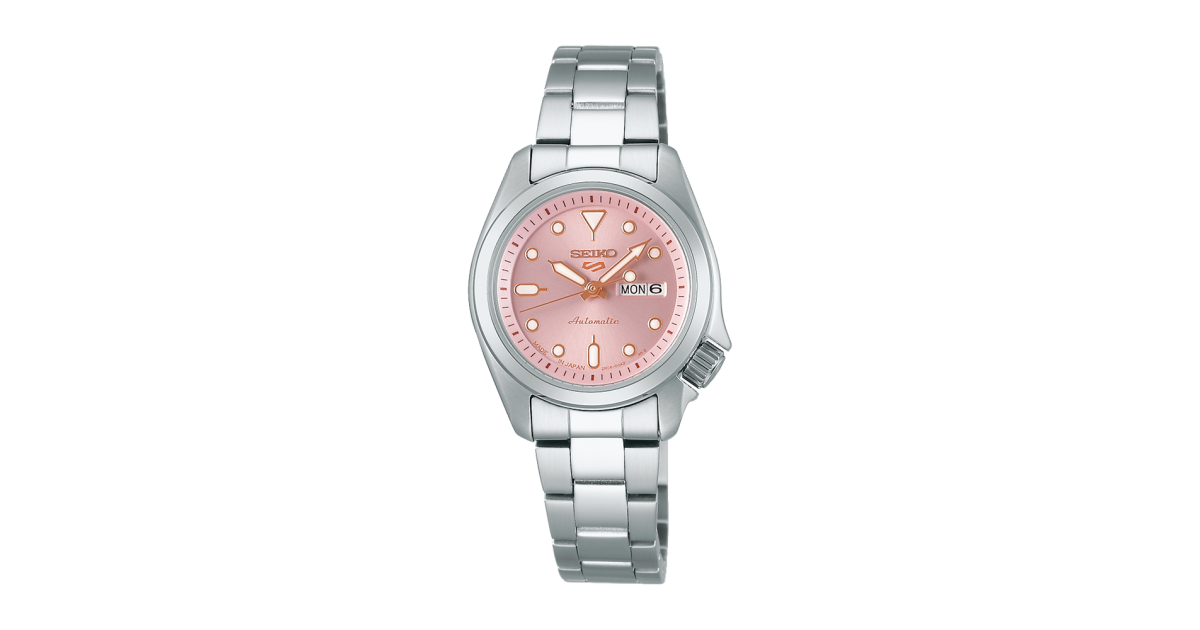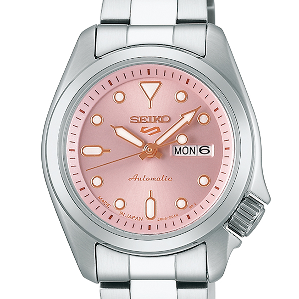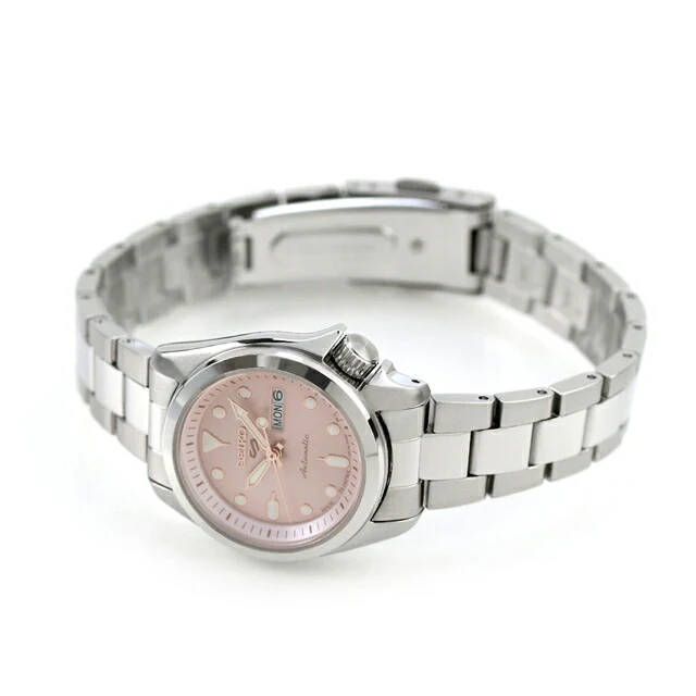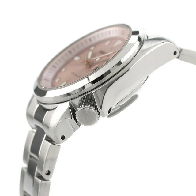 Seiko 5 Sports SKX series SRRA003 – ladies watch manufactured by Seiko. It has Japanese automatic movement and 2R06 calibre. Stainless steel case of round shape. Case dimensions are 28 mm. in diameter and 11.2 mm. in thickness. The dial of this Seiko watch is pink. Display type: analog. This timepiece has hardlex glass. Stainless steel band, band color: silver. 100 m. water resistance. The watch is from 5 Sports collection. The following features are equipped: date, antimagnetic, glowing hands, glowing markers, day.