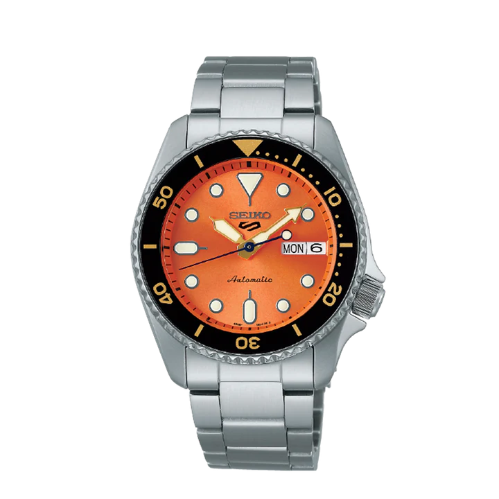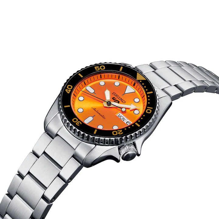 Bold and stylish, the Seiko 5 Sports SKX SRPK35K1 stands out with its vibrant midi orange dial and robust stainless steel strap. Inspired by the iconic SKX series, this watch blends sporty aesthetics with everyday versatility, making it a must-have for those who love to make a statement.