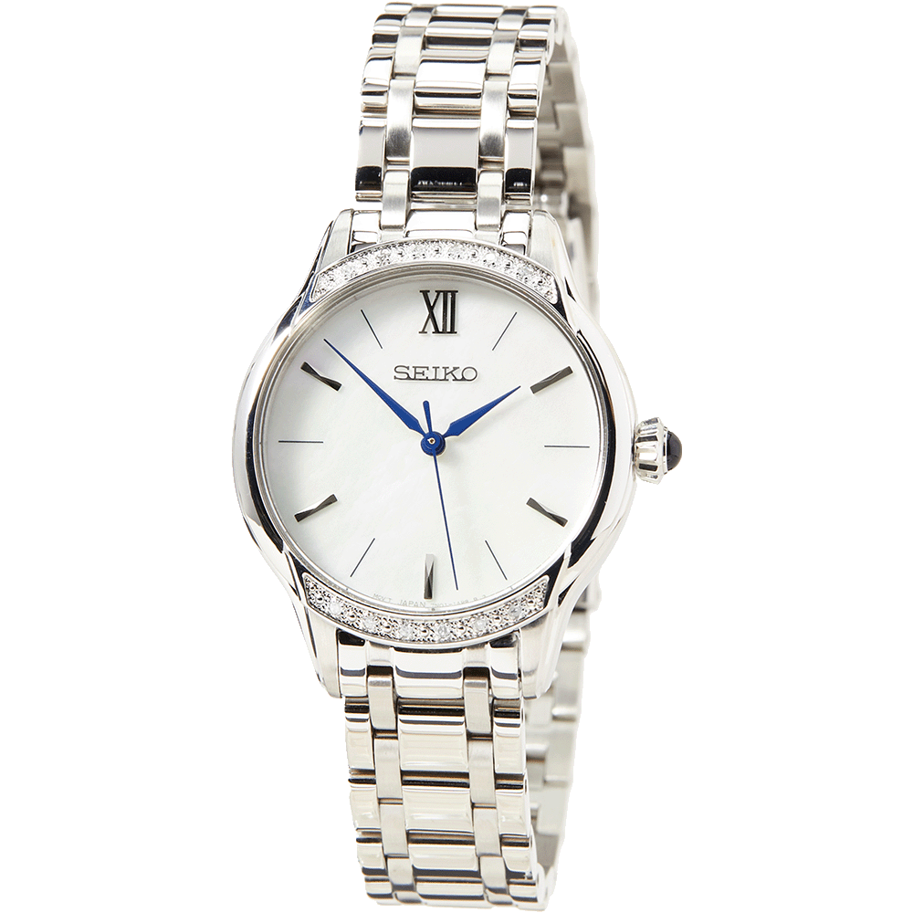 Its mother-of-pearl dial is adorned with genuine diamond hour markers, exuding a subtle sparkle with every movement. The classic Roman numerals and blue hands enhance its graceful appeal, while the scratch-resistant sapphire crystal ensures durability and long-lasting brilliance. Powered by a reliable quartz movement, the SRZ543P1 provides precise timekeeping with minimal maintenance.