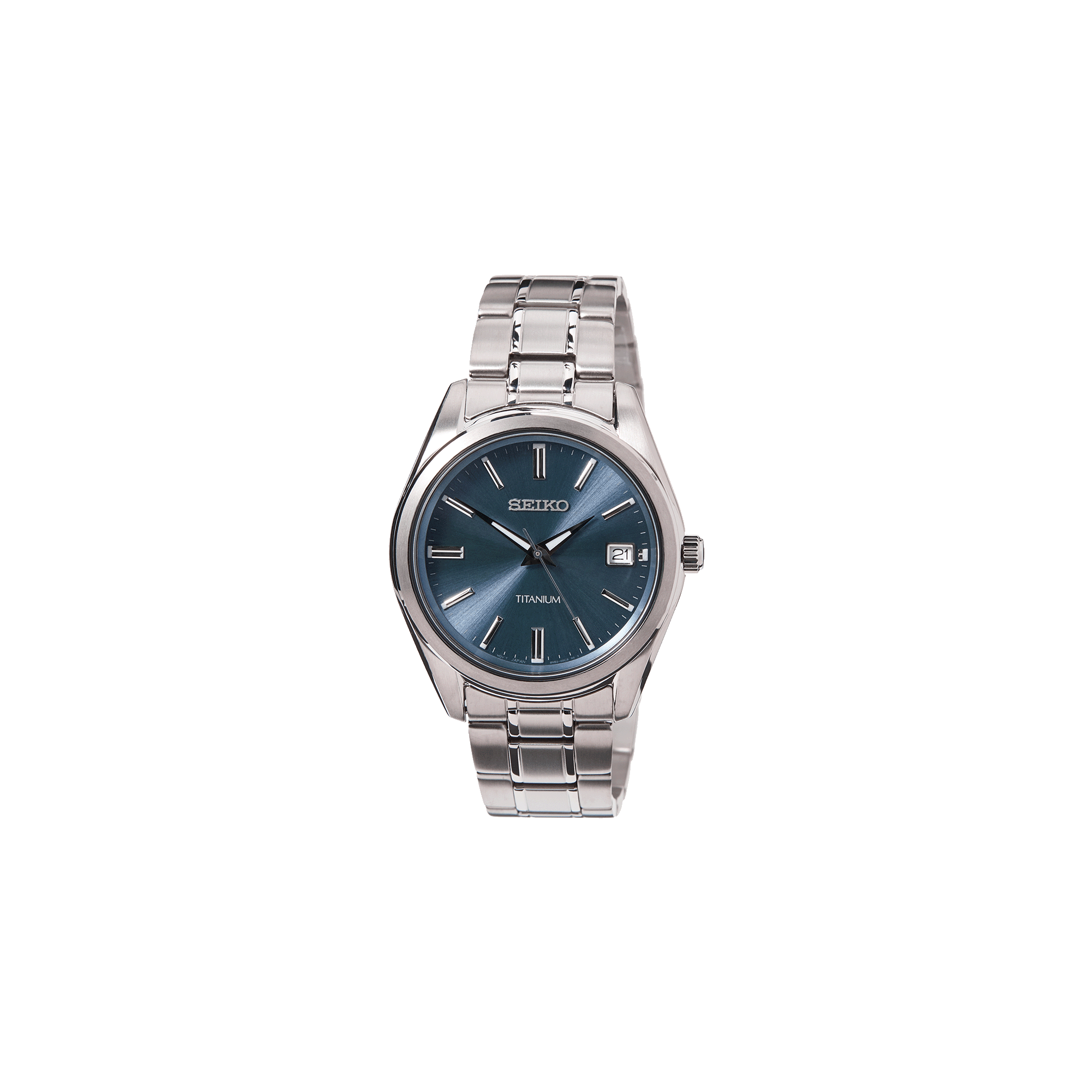 Titanium case and bracelet. Fixed titanium bezel. Blue dial with luminous silver-tone dauphine-style hands and index hour markers. Minute markers around the outer rim. Dial Type: Analog. Luminescent hands and markers. Date display at the 3 o’clock position. Seiko Caliber 6N52 quartz movement. Scratch resistant sapphire crystal. Pull / push crown. Solid case back. Round case shape, case size: 40.2 mm, case thickness: 8.4 mm. Band width: 18 mm. Fold over clasp with a safety release. Water resistant at 100 meters / 330 feet. Functions: date, hour, minute, second. Classic Series. Casual watch style. Seiko Classic Quartz Blue Dial Men’s Watch SUR371P1.