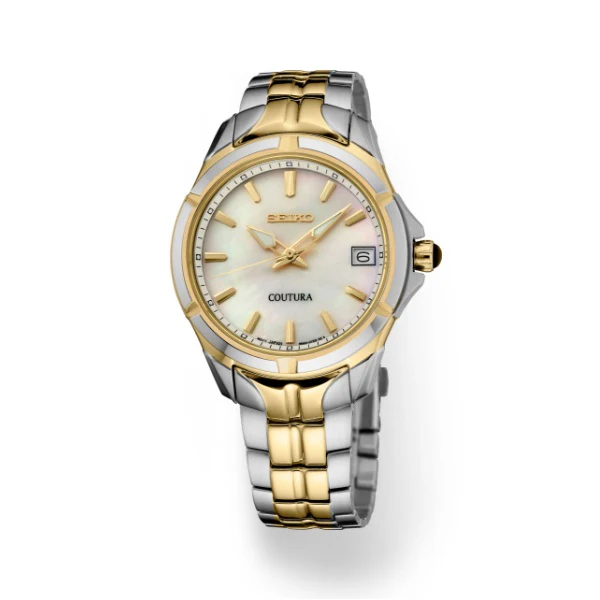 From the Coutura Collection. Expressing a polished and modern sophistication, the Coutura Collection combines bold angularity and elegant design with superior timekeeping for an effortless sport/dress aesthetic. This versatile timepiece, perfect for day-to-night style, features a classic white mother-of-pearl dial with gold applied indices, adding a rich 3-dimensional appearance to the elegant look. Crafted of stainless steel, with a perfectly proportioned case and bracelet for a streamlined fit, this graceful watch is topped with a scratch-resistant sapphire crystal and includes LumiBrite hands and markers, a date calendar, a classic cabochon crown, and a tri-fold push-button release clasp. 10 bar, 100M Water Resistant.