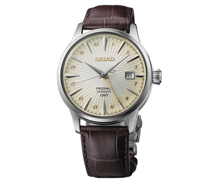 Step into timeless elegance with the Seiko Presage Acacia Cocktail Time GMT SSK041J1, a watch that captures the golden glow of a perfect evening. Imagine sipping a rich acacia cocktail in a jazz lounge—the warm champagne dial and brown leather strap evoke that exact feeling of relaxed luxury and effortless charm.