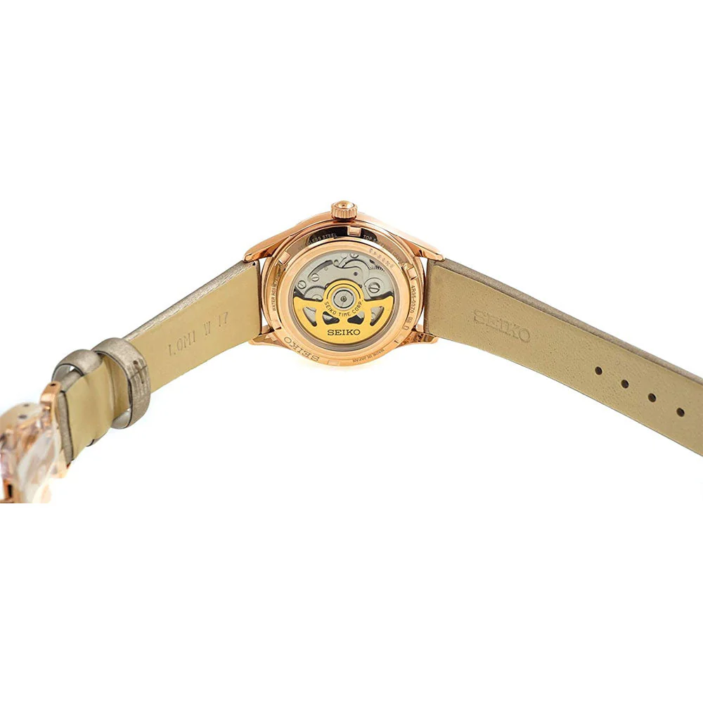 The Seiko Presage SRPF50J1 is an elegant automatic ladies’ watch from Seiko’s Presage collection, blending Japanese craftsmanship with timeless sophistication. Featuring a 34.3mm stainless steel case and a dual-curved sapphire crystal, this watch offers durability and scratch resistance. The champagne dial with Roman numeral hour markers exudes classic charm, while the rose gold-tone accents enhance its luxurious appeal.