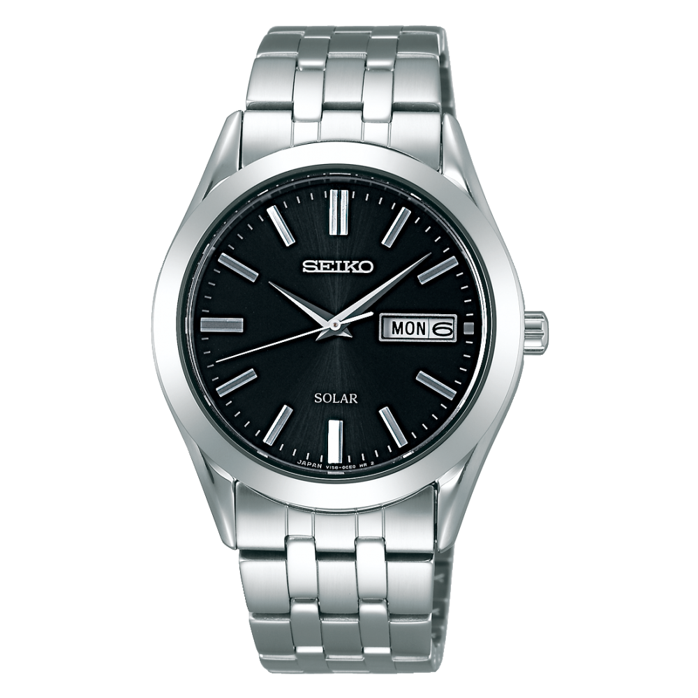 Seiko Selection SBPX083 – men’s watch manufactured by Seiko. It is equipped with Japanese solar quartz movement and V158 calibre. Stainless steel case of round shape. Case dimensions are 37.4 mm. in diameter and 9.2 mm. in thickness. The dial of this Seiko watch is black. Display type: analog. This timepiece has sapphire glass. Stainless steel band, band color: silver. 30 m. water resistance. The watch is from Seiko Selection collection. The following features are equipped: date, day.