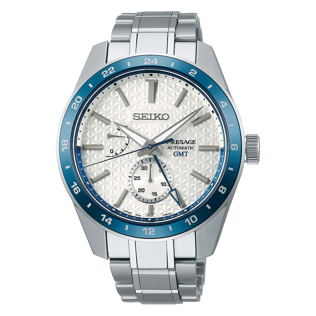 Released in 2021, the Seiko calibre 6R64 is an automatic movement used in the Presage Sharp Edged Series GMT watches. In addition to hours, minutes, and seconds, it features a power reserve indicator, a running seconds sub-dial at six o’clock, and a GMT hand to mark the second time zone. It is composed of 29 jewels and runs at a frequency of 28,800 vibrations per hour. Made in Japan, calibre 6R64 boasts a power reserve of 45 hours.