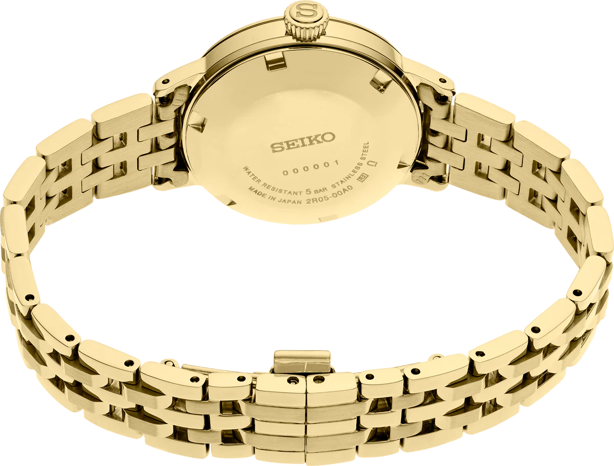 GOLD FINISH for an elegant classic dress timepiece featuring diamond markers and a Seiko Presage Cocktail Time Eggnog Automatic Watch