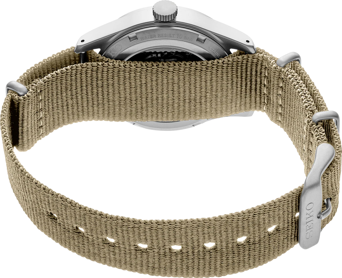 & Free ShippingThis black and beige version of the Seiko 5 Sports collection comes with a nylon strap, a little added touch to flaunt your adventurous spirit. This sporty and casual watch is the outcome of Seiko know-how, from the automatic calibre to the meticulous finishing. The black dial of this timepiece features a day/date display at 3 o’clock and the Seiko 5 collection logo at 12 o’clock.