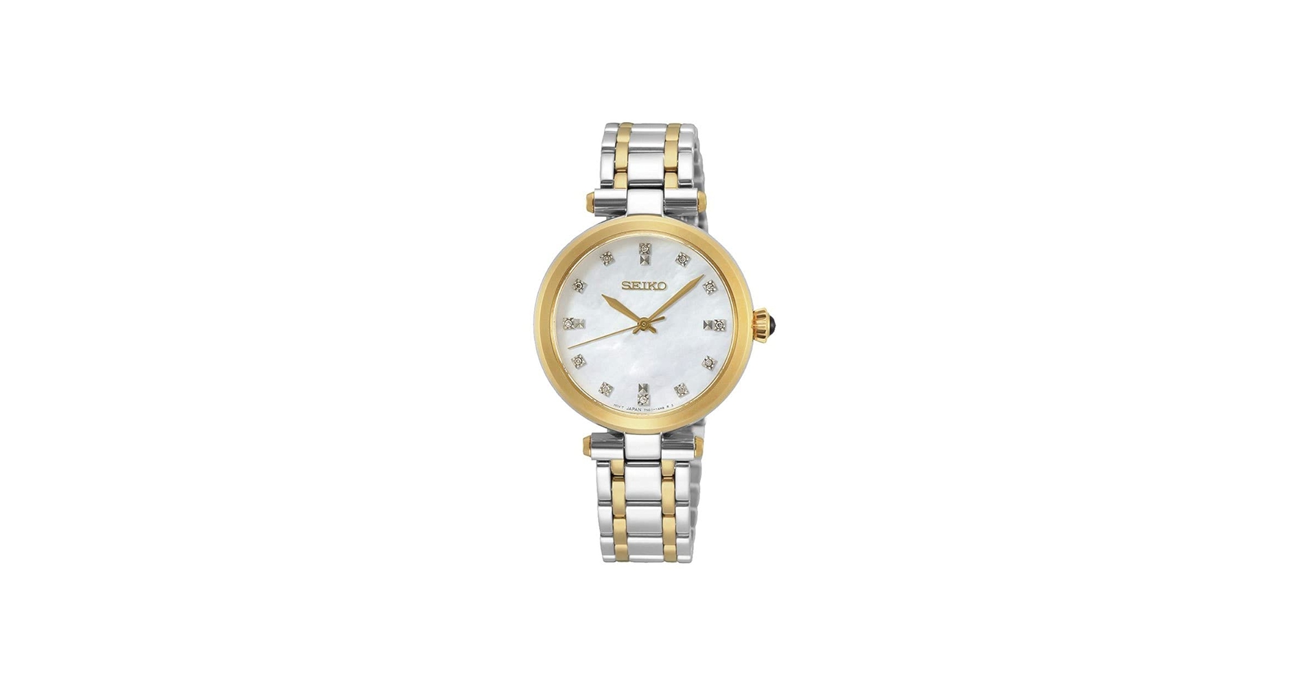 The Seiko Fashion/Style women’s watch impresses with sophisticated technology, elegant design, and high-quality craftsmanship. The stainless steel watch is powered by a quartz movement caliber 7N01. The watch’s mother-of-pearl dial features 12 sparkling diamonds and is protected from external influences by a scratch-resistant sapphire crystal. Another highlight: the crown with cabochon cut. A stainless steel bracelet with a folding clasp completes the beautiful timepiece. The Seiko Fashion/Style women’s watch – the perfect watch for every day!