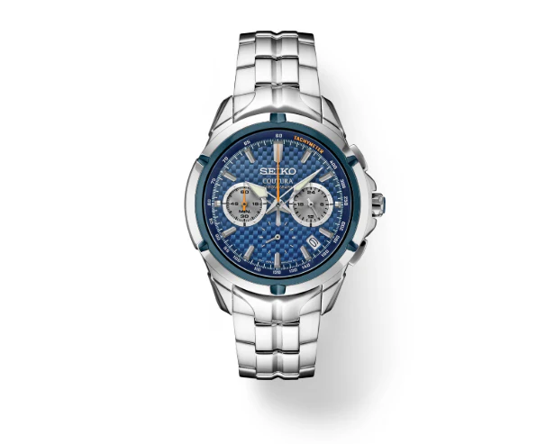The Seiko SSB431 is a men’s Coutura Quartz Chronograph watch, featuring a sporty-yet-refined design inspired by motorsports, with a striking blue carbon-patterned dial, stainless steel case/bracelet, sapphire crystal, and chronograph functions (up to 60 mins in 1/5 sec), date display, and 100M water resistance, powered by a reliable Caliber 8T63 quartz movement.