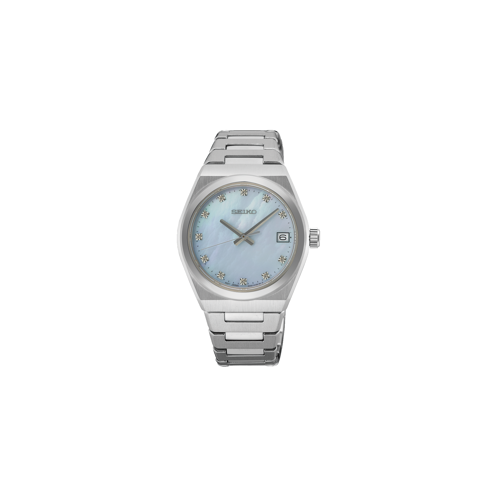 Add a touch of glamour to your outfit with this elegant Seiko ladies watch, featuring a stainless steel case, sapphire crystal, and a beautiful mother-of-pearl dial with diamond indices. The watch is equipped with a precise quartz movement and a comfortable stainless steel strap with a safety folding clasp. With its clear case shape and luxurious details, this watch is the perfect complement to any elegant outfit. Its precision is guaranteed with an accuracy of ± 15 seconds per month, making it a reliable accessory for any occasion.