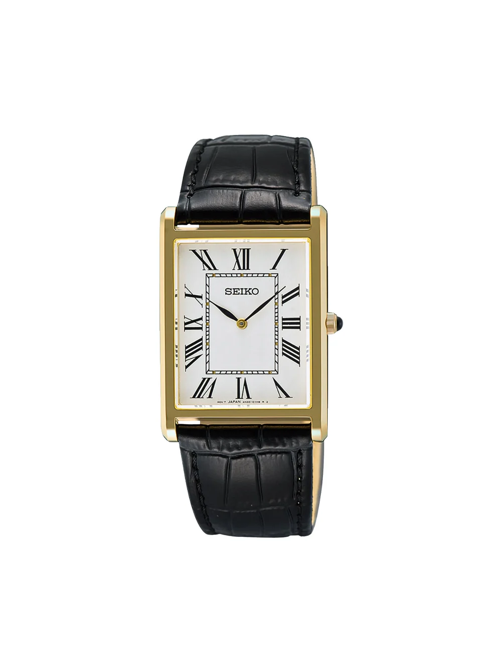 & Free ShippingThe Seiko SWR104P1 is a men’s quartz dress watch from the Seiko Classic/Essentials collection, noted for its elegant, rectangular design often compared to the “Cartier Tank” style. It features a gold-tone case, a white dial with Roman numerals, and a black leather strap.