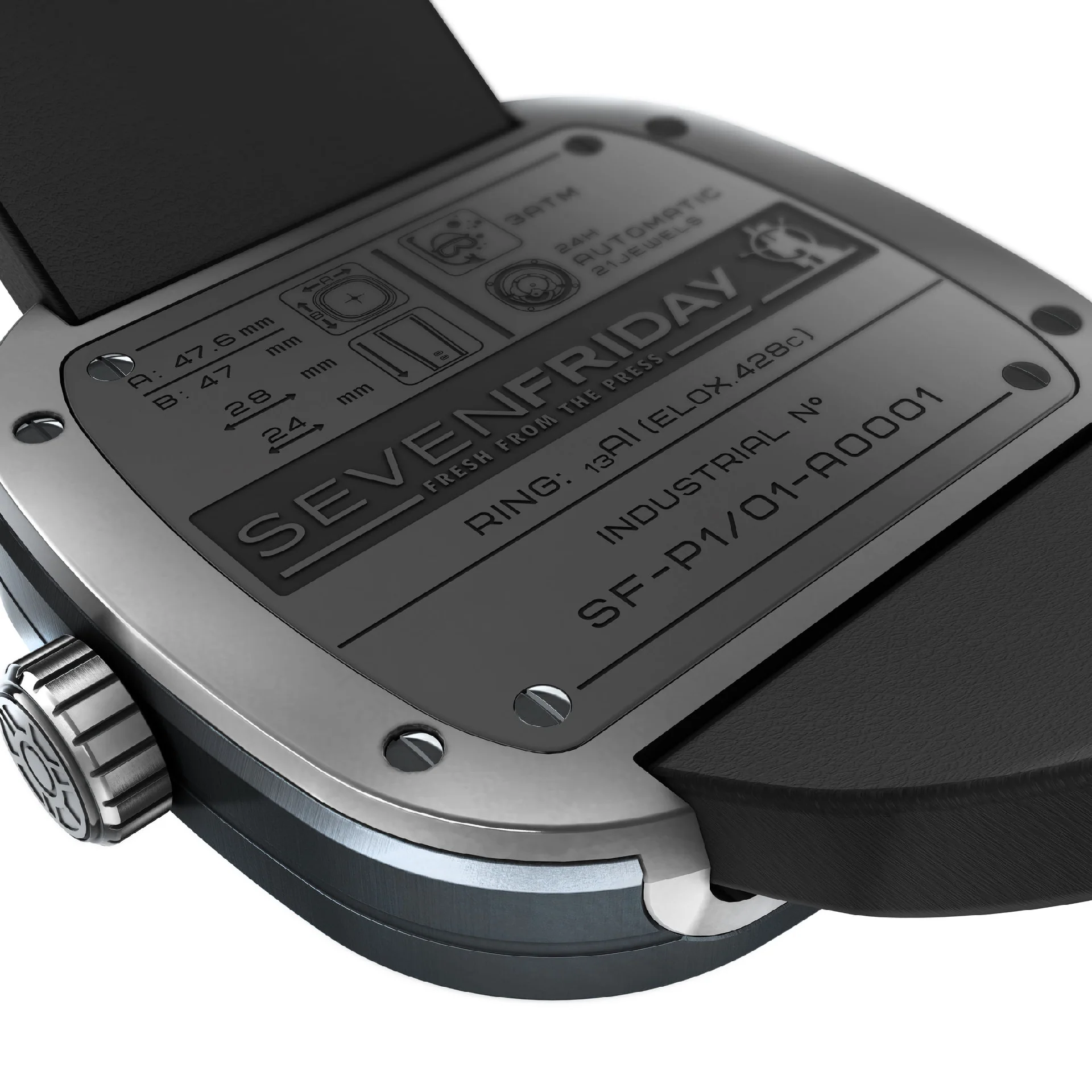Six layers of silver, rhodium and black discs, alternately finished with matt, brushed and circular treatment and oil black SEVENFRIDAY logo above the 12H mark