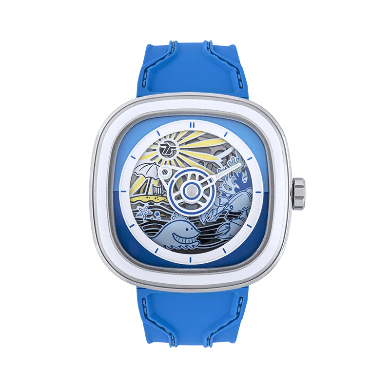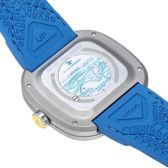 - Strap: Blue soft silicone strap with inlaid blue/green stitching’s and multiple SEVENFRIDAY patterns on the back
