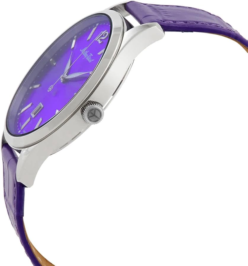 Silver-tone stainless steel case with a purple leather strap. Fixed silver-tone stainless steel bezel. Purple dial with silver-tone hands and index hour markers. Arabic numeral appears at the 12 o’clock position. Minute markers around the outer rim. Dial Type: Analog. Luminescent hands and markers. Date display at the 6 o’clock position. Ronda Caliber 515 quartz movement. Scratch resistant sapphire glass crystal. Pull / push crown. Solid case back. Round case shape, case size: 42 mm, case thickness: 8 mm. Band width: 20 mm. Tang clasp. Water resistant at 50 meters / 165 feet. Functions: date, hour, minute, second. Urban Series. Casual watch style. Watch label: Swiss Made. Mathey-Tissot Urban Quartz Purple Dial Men’s Watch.